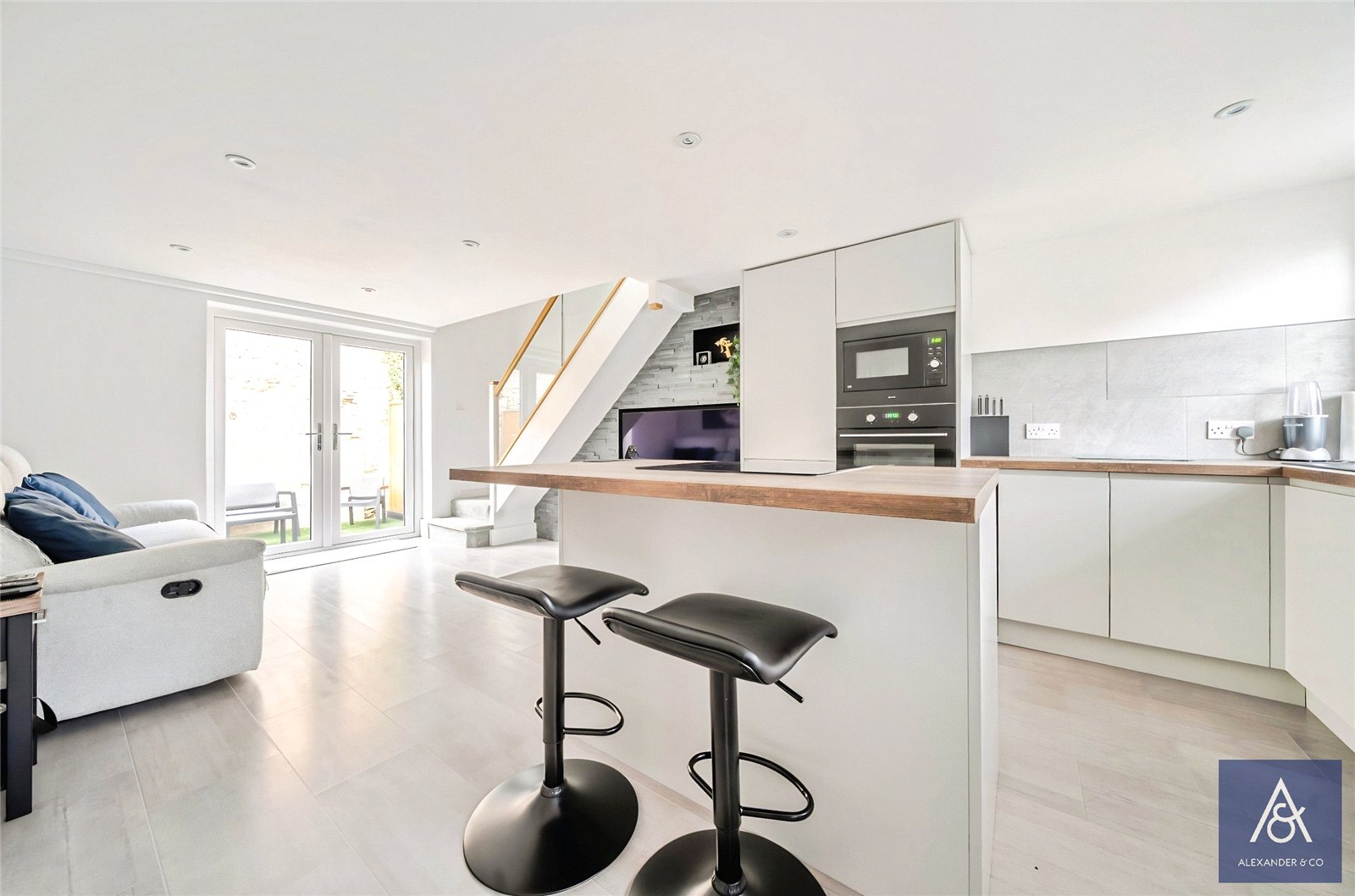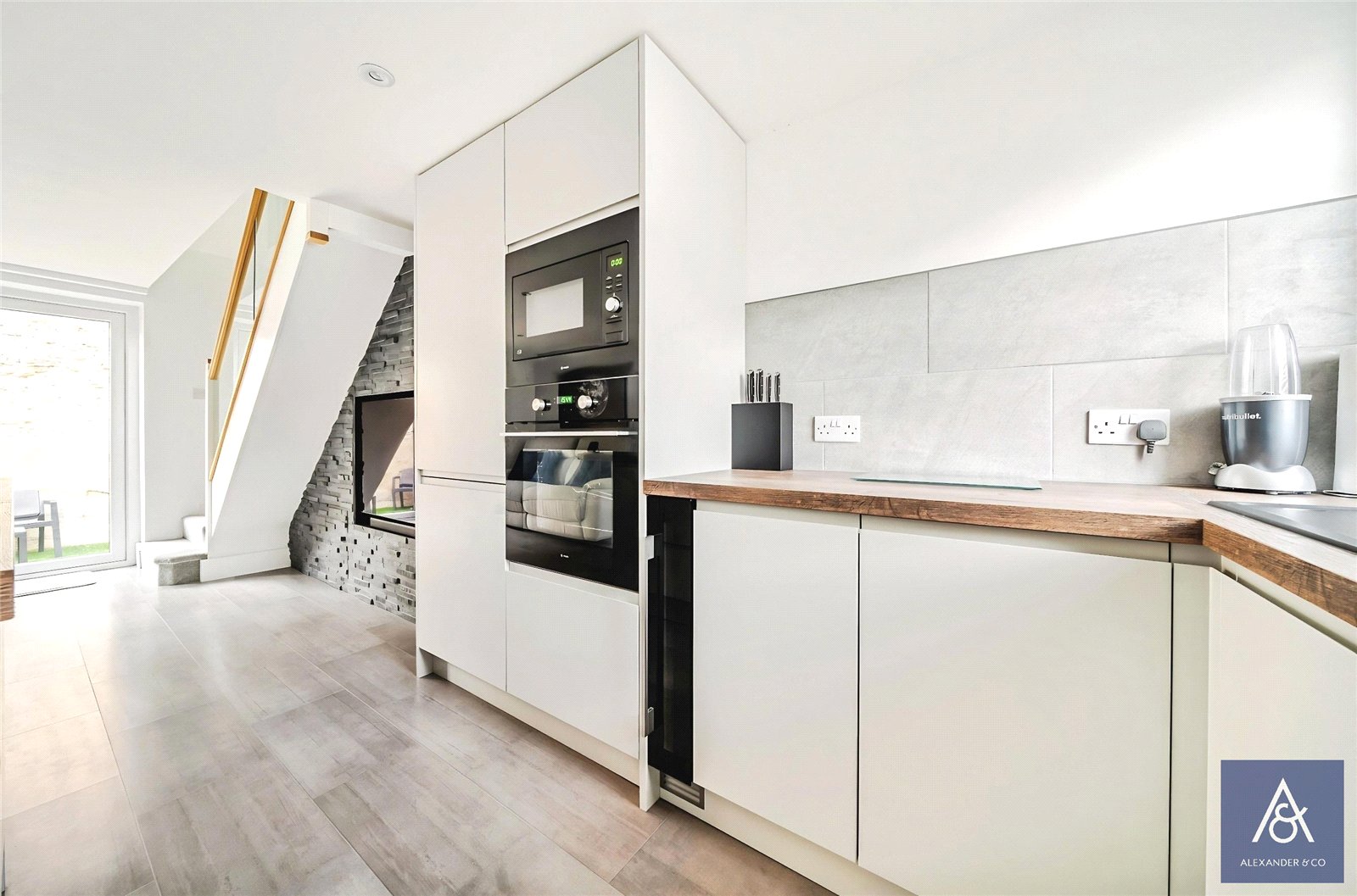 The entrance door opens into the open-plan kitchen and living area. The kitchen is fitted with a range of base-level units and integrated appliances, including an oven, microwave, fridge/freezer, wine rack, integrated washing machine & dryer and electric cooker. Wood-effect worktops and cabinets complete the modern finish of this stylish kitchen. The living area features double doors that open onto the rear courtyard, while stairs rise to the first floor.