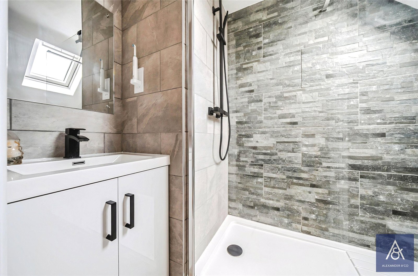 Upstairs, the landing provides access to the bathroom, an airing cupboard, and the bedroom. The bathroom is fitted with a walk-in shower, wash basin, and WC. The bedroom allows for a double bed. The main velux window is motorised to be operational by a control panel, to open/close and operate the blind.
