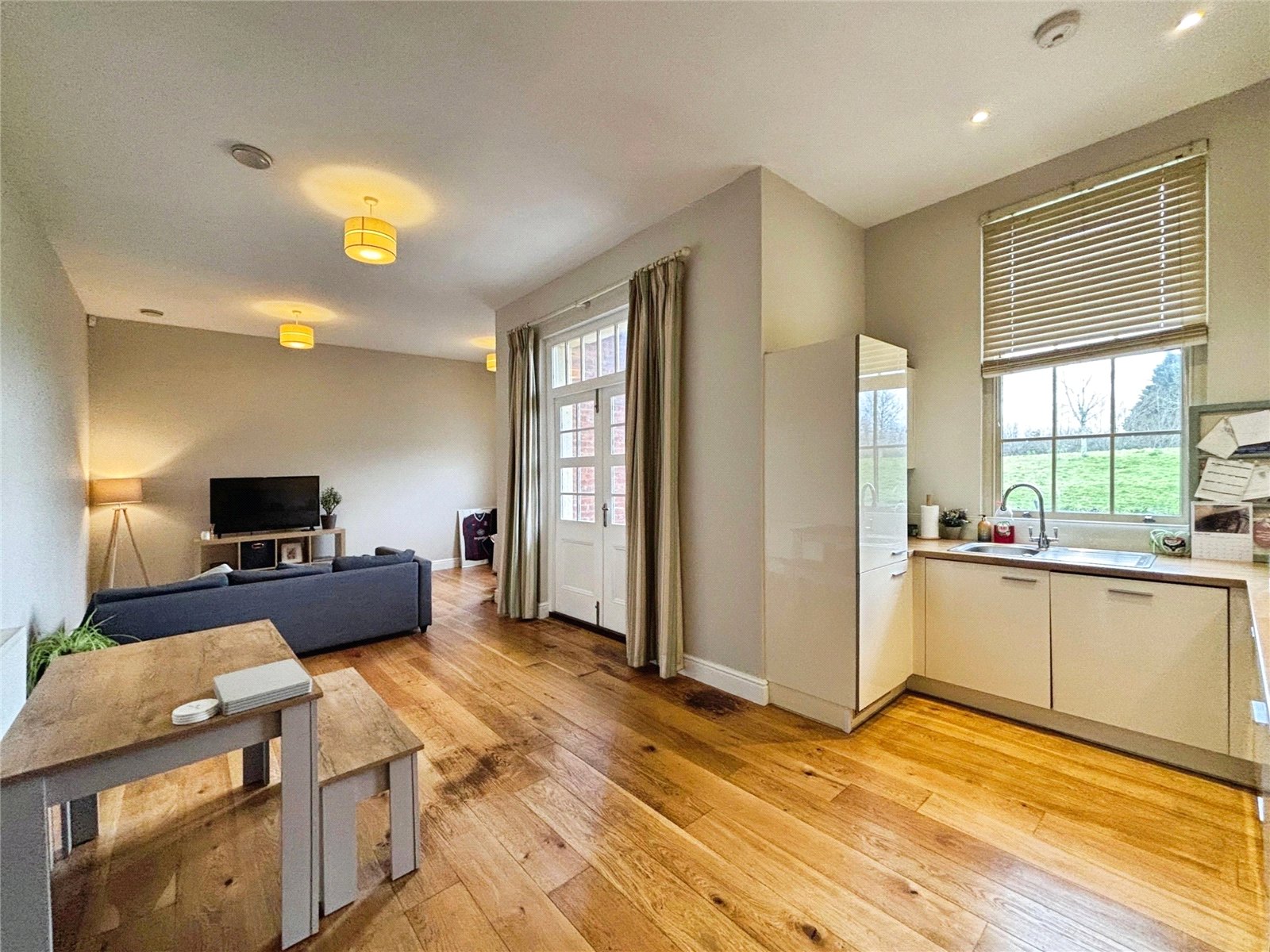 The open plan lounge/kitchen/diner has solid oak flooring and enjoys plenty of light from the three sets of windows. French doors open out on to the South-facing patio area, overlooking beautiful communal gardens.