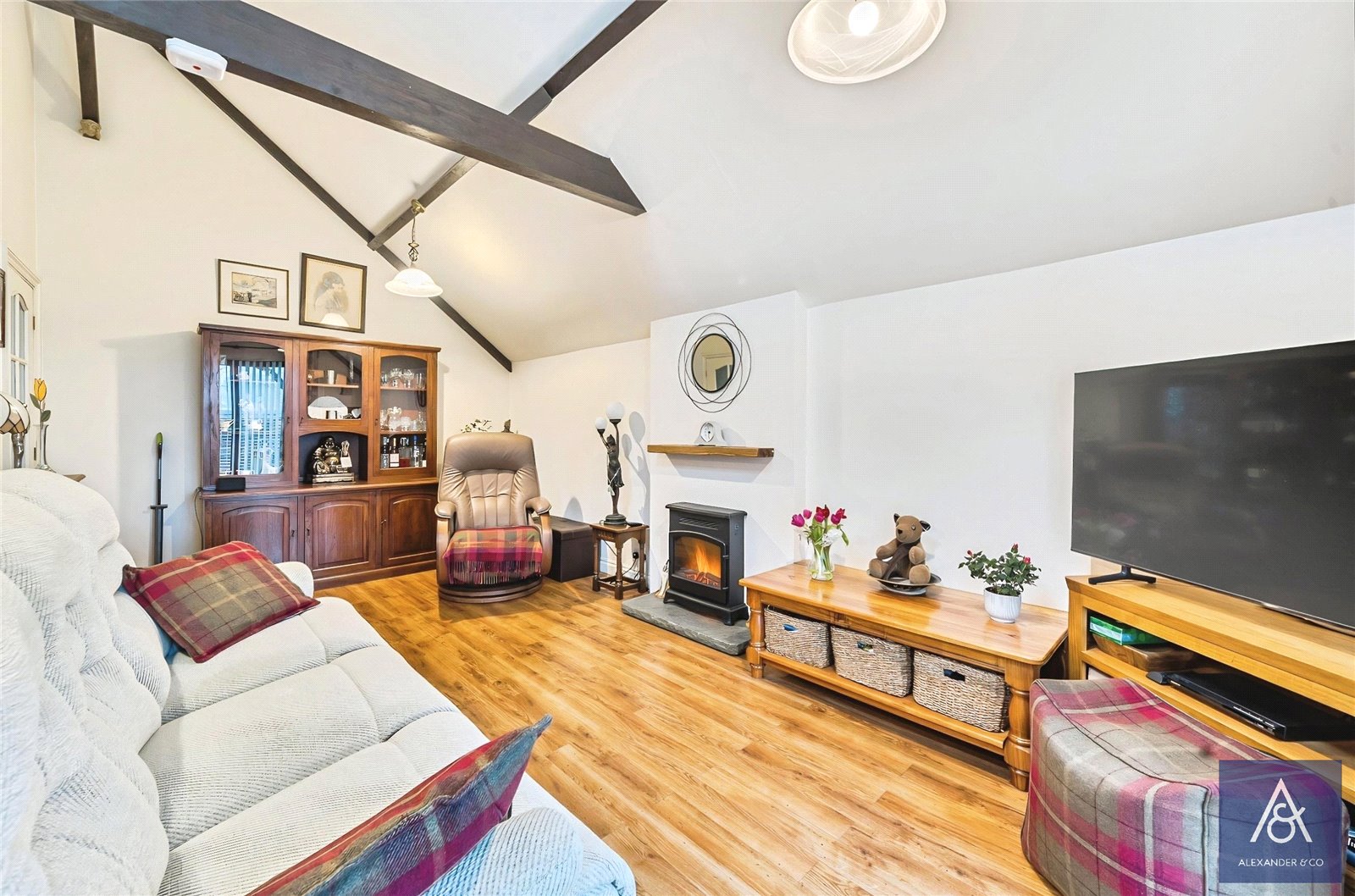 The spacious lounge features a stunning vaulted ceiling with exposed timbers and is located to the rear of the property, enjoying views over the low-maintenance garden and surrounding countryside. The modern kitchen is fitted with a range of base and wall units with rolled-edge work surfaces and also benefits from a vaulted ceiling. The spacious conservatory, currently used as a dining room, provides access to the sunny rear garden. There are two bedrooms, both with fitted bedroom furniture, which are served by a well-appointed shower room.
