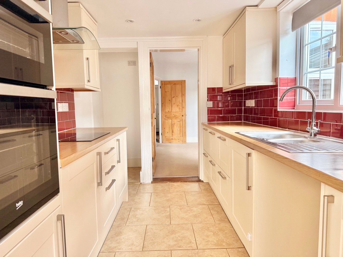 The kitchen, located at the rear of the property, is fitted with cream shaker-style base and eye-level units, worktops with tiled splashbacks, and an inset one-and-a-half stainless steel sink and electric hob. Space is available for a tall fridge and washing machine. A half-glazed door opens onto the paved patio area, creating a seamless indoor-outdoor flow—ideal for entertaining.