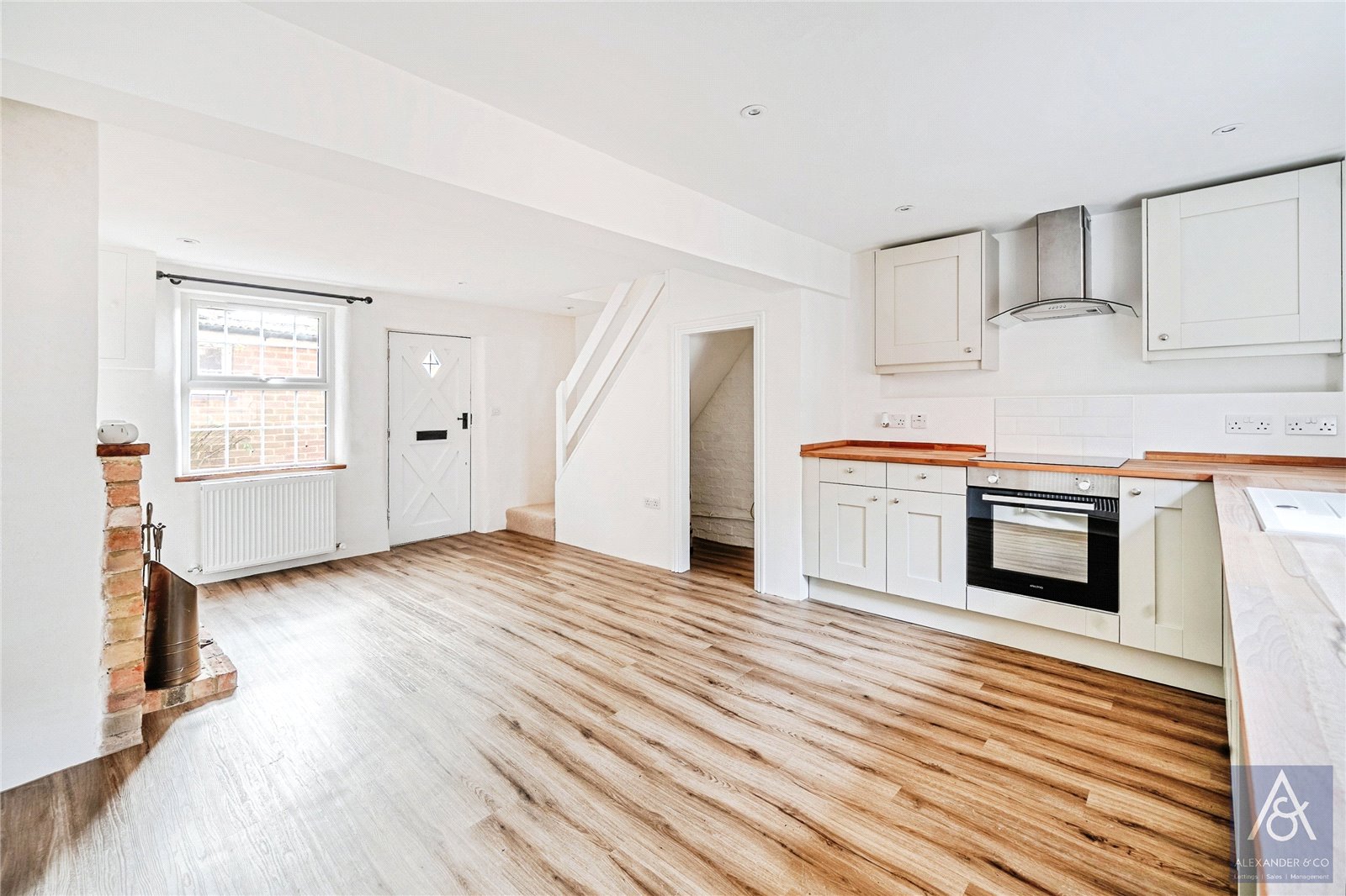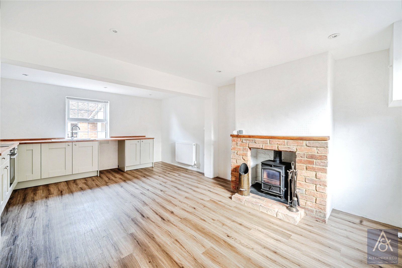 The property is entered via the main door into an open plan dual aspect main room with sitting room area leading onto the kitchen/dining area. There is a brick open fireplace on raised brick hearth and wooden mantle above with inset multi fuel burner, stairs rising to the first floor and understairs storage and ceiling downlighters. The kitchen/diner has a range of traditional base and eye level units with 'Beechwood' block work surfaces incorporating a ceramic sink and drainer with mixer taps, built in oven with extractor above, space for fridge/freezer and washing machine.