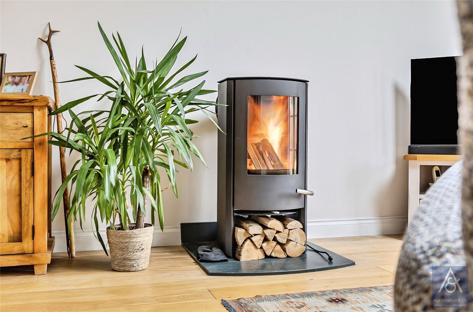 The ground floor features a bright and spacious open-plan kitchen, living and dining area, thoughtfully designed to maximise natural light. The contemporary kitchen is fitted Honister Slate countertops with quality units, ample worktop space, and integrated appliances, flowing seamlessly into the living area. A charming log-burning stove creates a cosy focal point, while double doors provide access to the outside, enhancing the sense of space and connection to the garden.