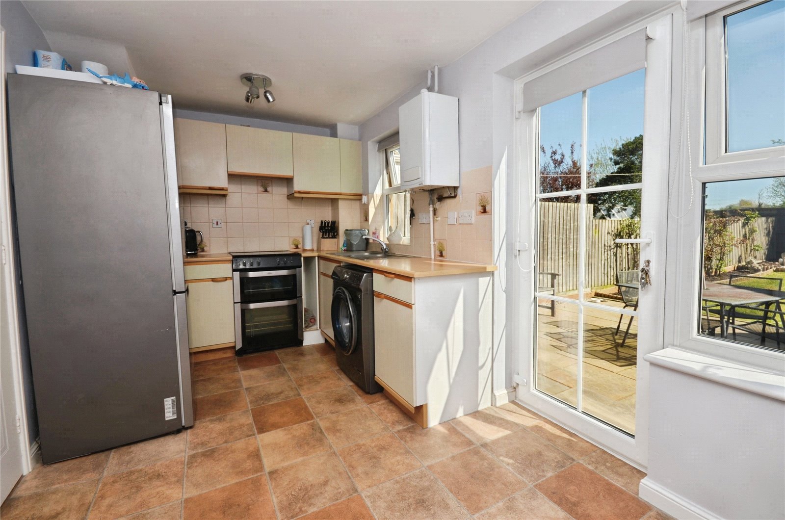The rear garden has two patio areas, fence enclosed with a courtesy door into the garage at the rear. In front of the garage and to the side of the garage is a parking. To the front there is small grass garden and path leading to front door.