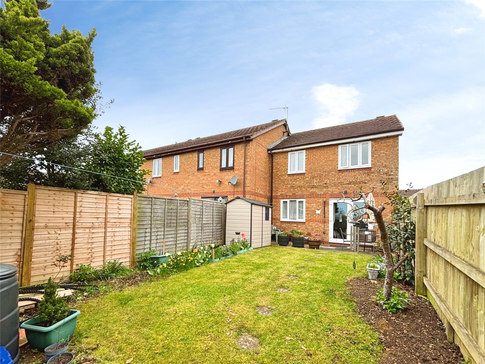 The private South-facing rear garden is mainly laid to lawn, with a patio area, new shed and gate for side access.