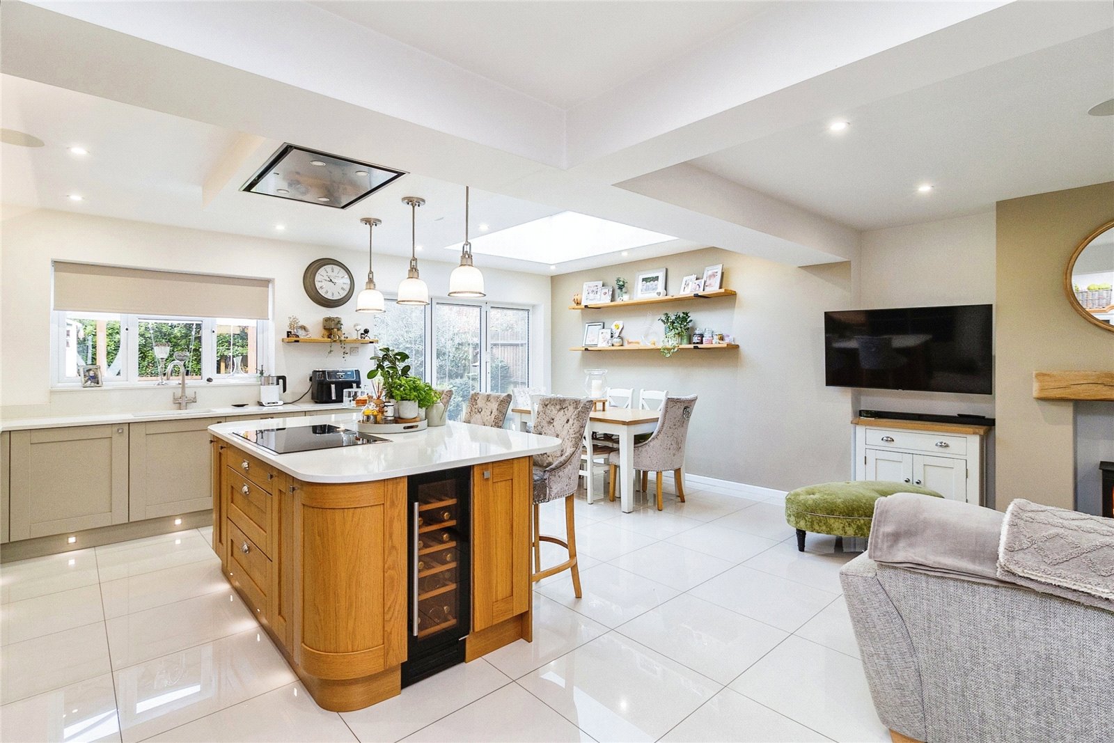 The house itself begins with a welcoming entrance hall with wood flooring flowing through to the bay fronted living room. Moving through to the main hub of the house which is the 24ft kitchen, dining and family area. The kitchen is an arrangement of solid wood eye and base units complimented by a Quartz worktop, integrated appliances which include self-cleaning oven, Vairo steam oven, coffee centered as well as filtered and hot water taps. A central island incorporates an induction hob with vented ceiling extractor and the dining space has a sky lantern above with a family area which has a cosy log burner for relaxing after dinner. Porcelain tiled floor with underfloor heating system and bi fold doors onto the garden complete this room.