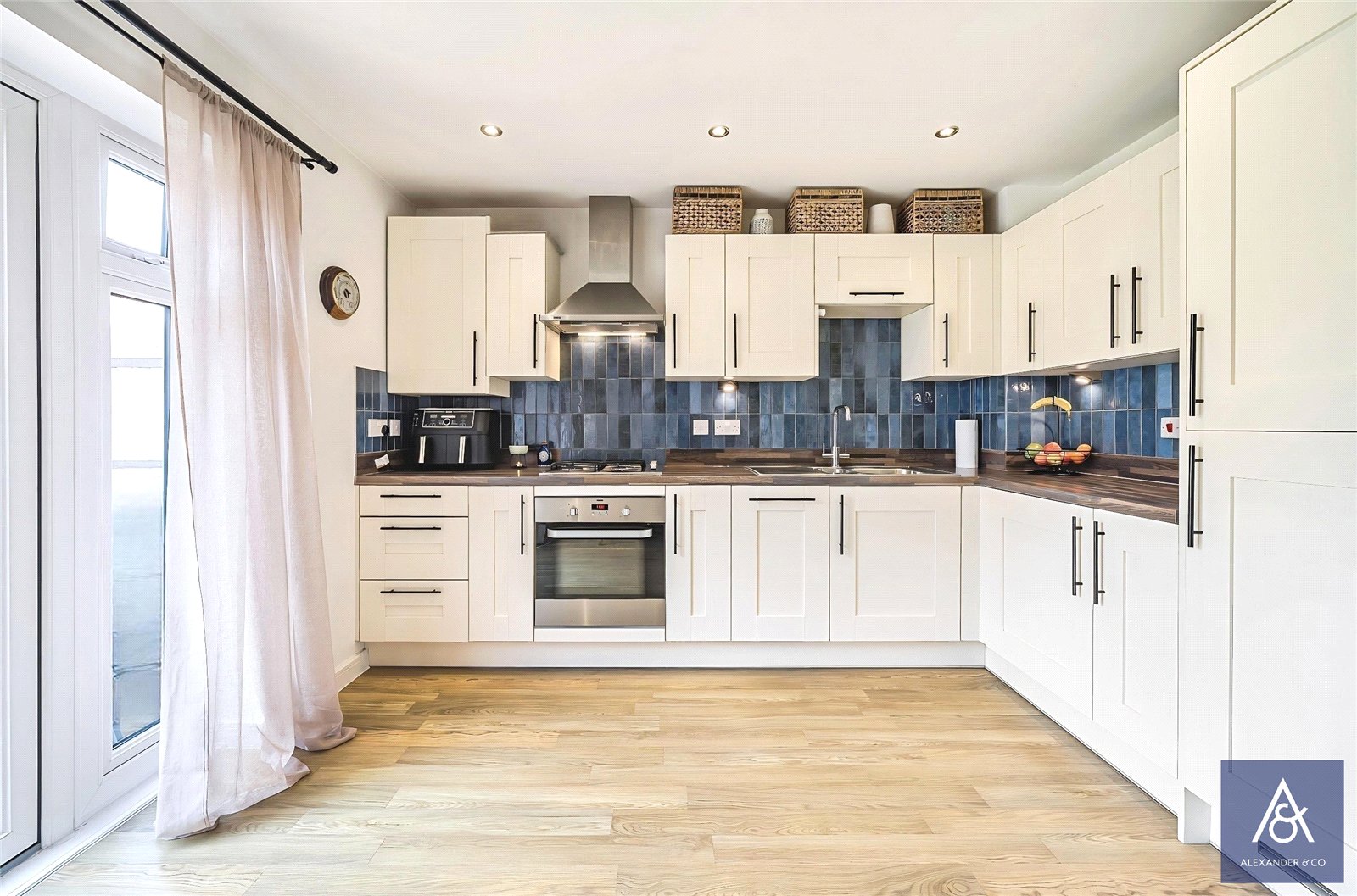 The front door opens to the hallway. The cloakroom is fitted with a white two-piece suite. The living room looks to the front; stairs rise to the first floor with storage under and a door opens to the kitchen/dining room. The kitchen is comprehensively fitted with a range of matching units. Integrated appliances comprise integrated four ring gas hob with canopy filter over and single combination oven under, fridge/freezer, dishwasher and washing machine. French doors open from the Dining area into the rear garden.