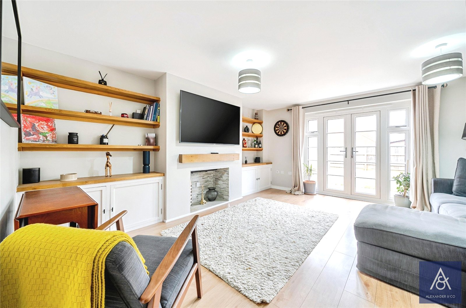 The kitchen-breakfast room is to the front of the property and has been fitted with a range of base and wall units with rolled edge worksurfaces. The light and airy lounge is a wonderful size and has a feature wall with built in storage, display shelfing, and French doors opening onto the good size rear garden. The downstairs cloakroom completes the ground floor accommodation.
