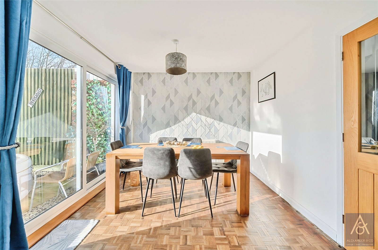 To the rear, the open-plan kitchen/dining room has been fully refurbished and features patio doors opening onto the large, south-west facing garden. There is ample space for a large dining table, making it ideal for entertaining. The kitchen is fitted with a range of eye- and base-level units, integrated dishwasher, oven, grill and hob with extractor above, and space for additional appliances. A separate utility room provides further storage, plumbing for white goods, and an additional rear access point. A downstairs cloakroom completes the ground floor accommodation.