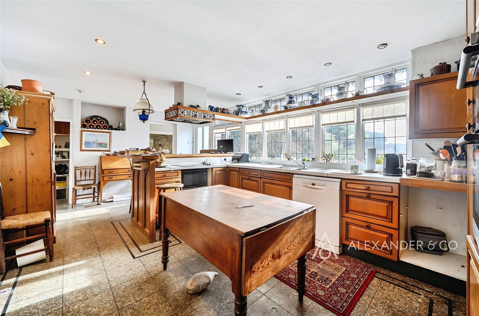 A central hallway welcomes you into the property from the front. The spacious living room enjoys a front-facing aspect, as does the versatile sitting room, which features stairs rising to the first-floor landing and descending to a useful storage room. The dining room links seamlessly to the kitchen and opens out to an enclosed courtyard, creating an ideal space for entertaining. The kitchen overlooks the rear garden and countryside beyond, with access to the conservatory and an inner hall that leads to a workshop and a connecting door to the annex.