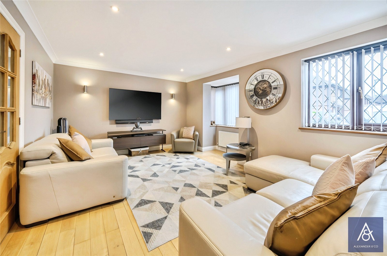 The front door leads to the hall with stairs rising to the first floor. Doors lead to the cloakroom, the kitchen/dining room and the living room which is a full width room looking out to the front. The kitchen and dining room have been combined into one light bright space which is comprehensively fitted including a centre island. Integrated Neff domestic appliances comprise an inset four ring gas hob with canopy extractor over, built-in double oven/combination microwave oven, fridge/freezer, washing machine and a dishwasher. There's an understairs store, door to the side and French doors opening to the rear garden.