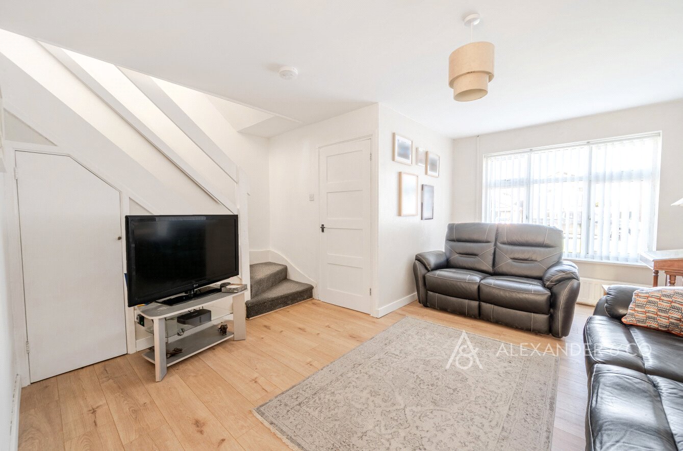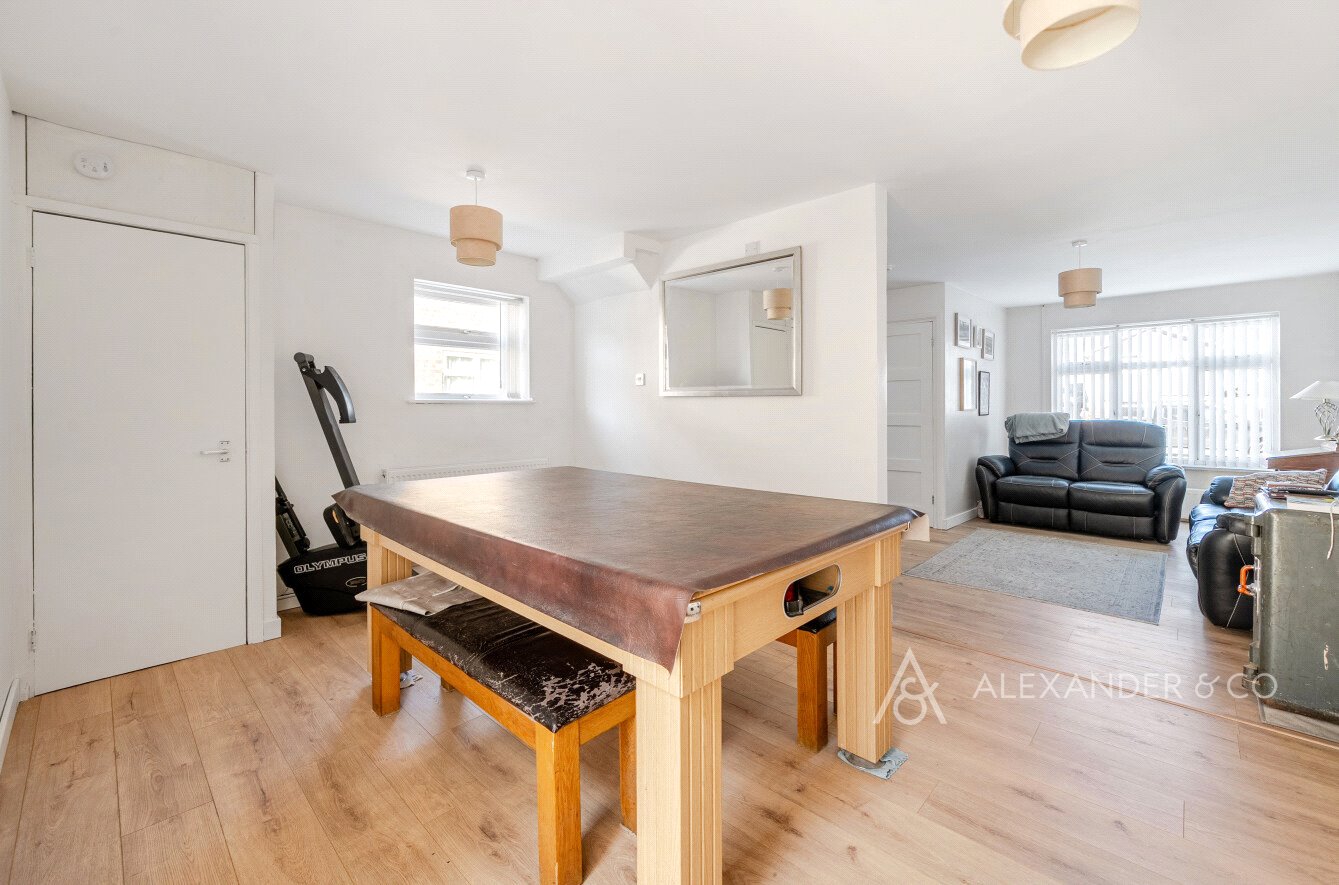The property has a small front garden with a driveway to the side with ample off road parking. The entrance hall has wooden flooring and a door into the cloakroom with a white wc and wash hand basin. The living room has a large window to the front and stairs leading to the first floor, open plan opening through to the dining room area with a storage / boiler cupboard. This space has ample room for table and chairs and leads through to the kitchen area which is in the extended area. There are shaker style base cupboards and drawers with worktops over. A one and a half composite sink with a kettle tap over, electric hob and two ovens. There is ample space for appliances and a glazed door opening to the side drive way and the rear garden also.