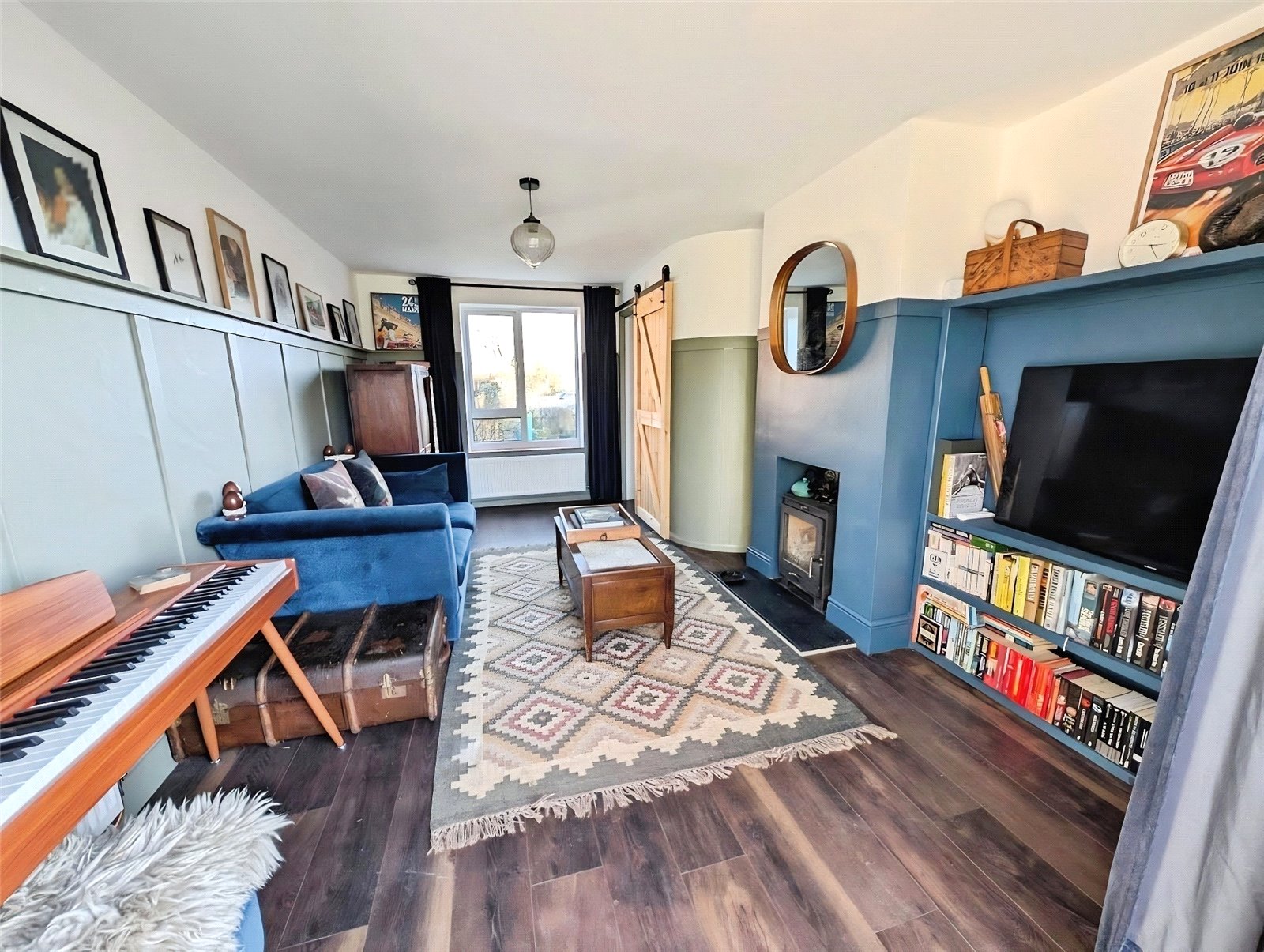 The living room enjoys a front-facing window and double doors opening onto the rear garden, creating a bright and sociable space. A wood-burning stove is recessed into the chimney breast and complemented by the rooms attractive wooden wall panelling.