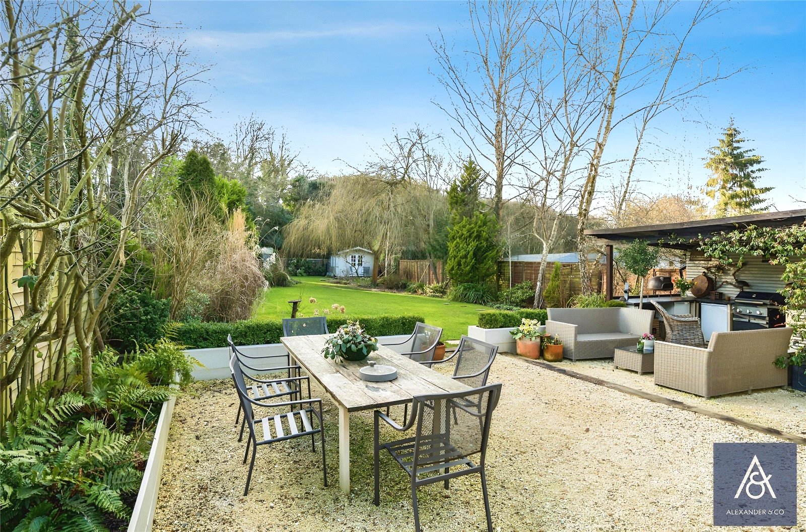 Outside, it’s a gardeners dream with the superb West facing rear garden attracting the afternoon and evening sun and being mainly laid to lawn with a large patio area and a covered outdoor kitchen area, plus a wood store. There are shrubs, bushes and small trees to the borders, with a large summer house to the end of the garden. There is gated access to the front of the property.