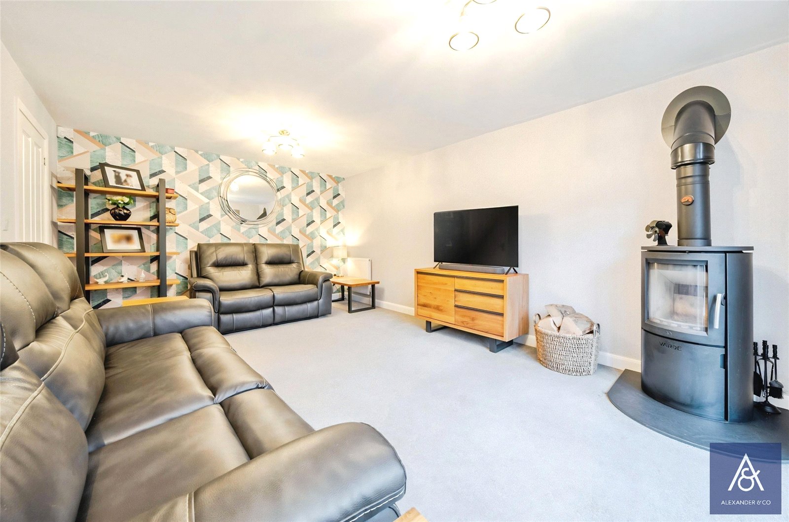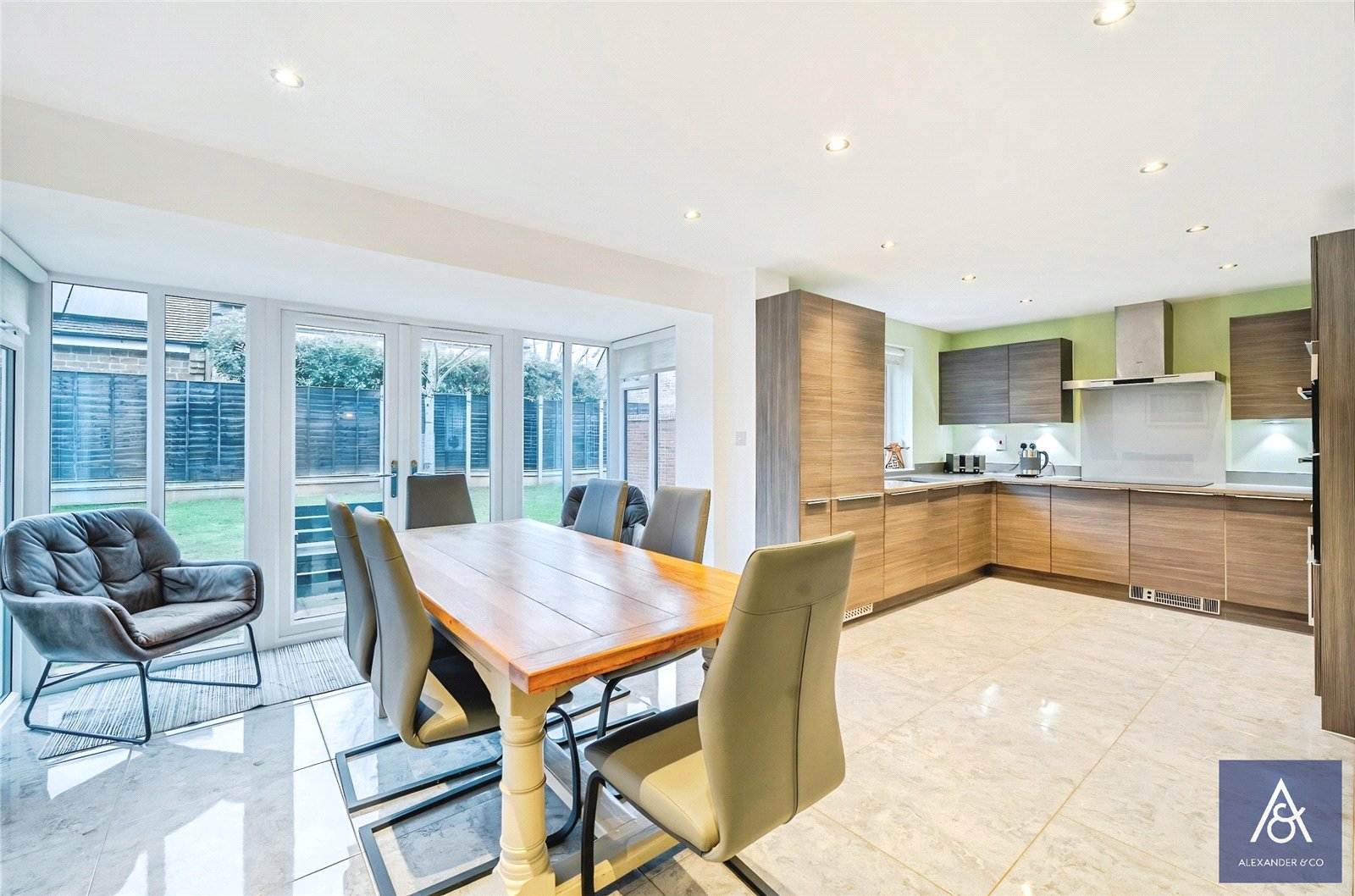 The reception hall leads to all ground floor rooms. The cloakroom has a white two piece suite. The study and the reception room both look to the front. The living room has French doors opening to the rear garden and a wood burning stove. The family/kitchen/breakfast room is comprehensively fitted with quartz worktop and a range of integrated domestic appliancesly. A full height walk-in box bay with French doors opens to the rear garden, and there is generous space for a table and chairs. The fitted utility room has a sink with spaces for a washing machine and tumble dryer and a door to the side.