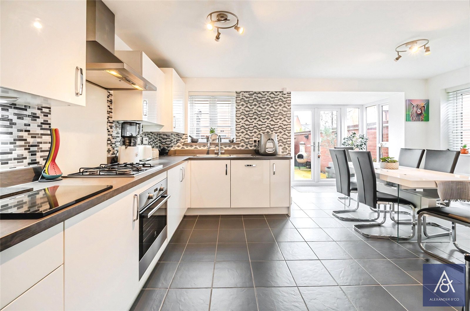 The entrance door opens into a welcoming hallway, with doors leading to the living room, kitchen/diner, and cloakroom. The living room enjoys a dual-aspect outlook, allowing plenty of natural light to fill the space. The contemporary kitchen is fitted with modern white cabinetry complemented by wood-effect worktops. Integrated appliances include a fridge/freezer, dishwasher, and washing machine. Doors from the kitchen provide access to the rear garden as well as useful side access. The cloakroom is fitted with a wash hand basin and WC.