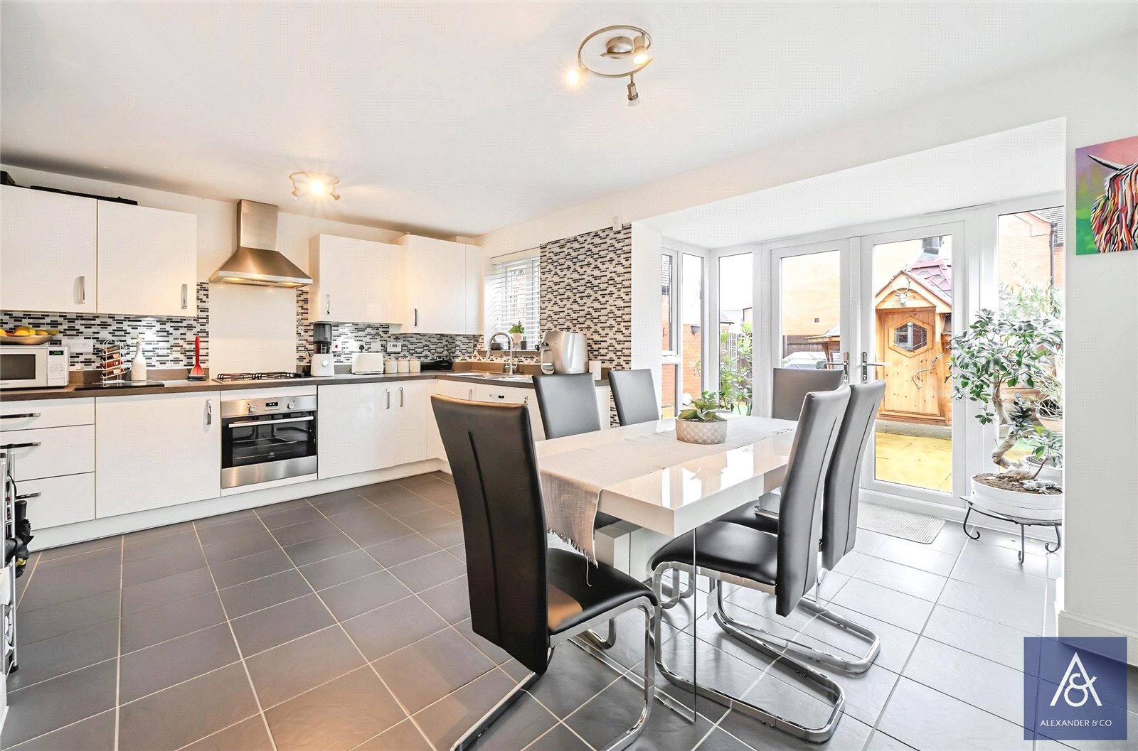 Outside, the rear garden is designed for low maintenance, laid mainly to artificial lawn with a patio seating area and offering both side and rear access. The single garage is equipped with power and lighting, with tandem parking available on the approach.