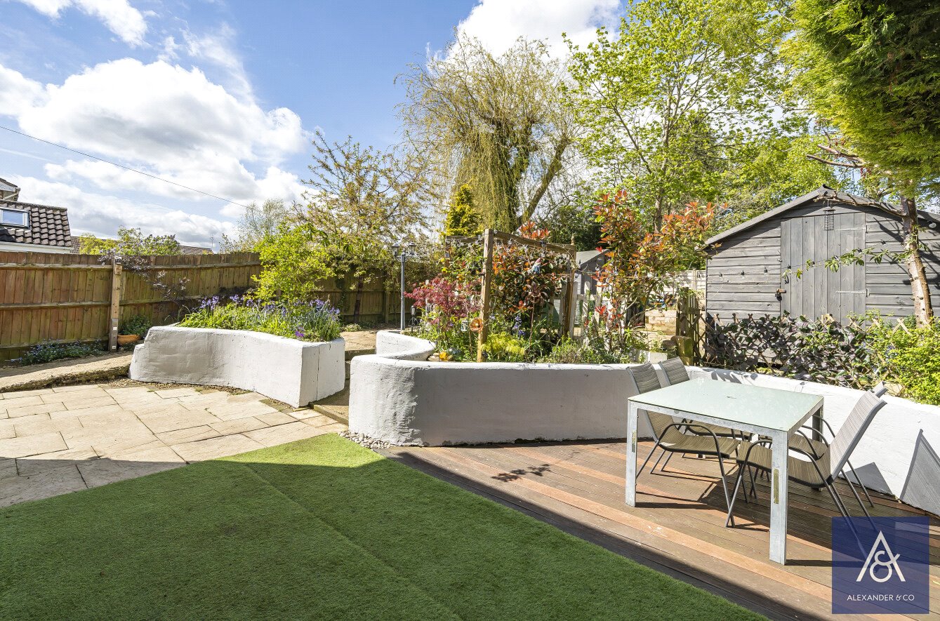 The lovely mature rear garden has been landscaped and offers a large paved patio area, a decking area, and an artificial grass lawn. There are several raised beds, a garden pond, a cold water tap, gated access to the front of the property, and timber garden sheds that give ample storage.