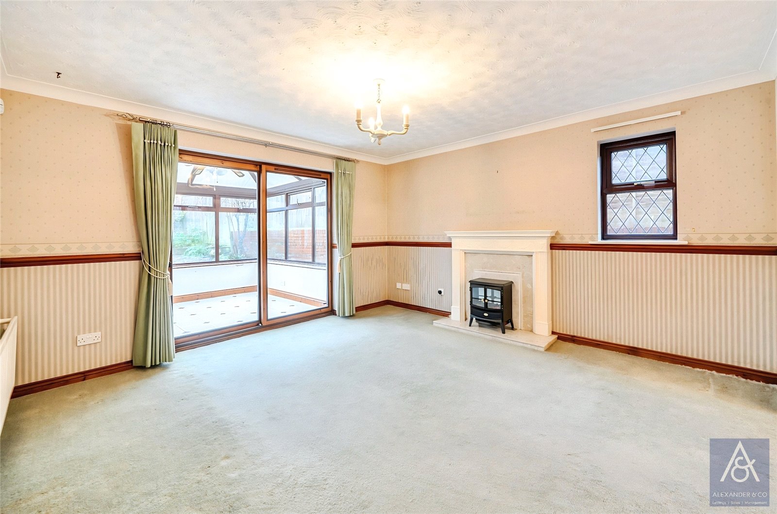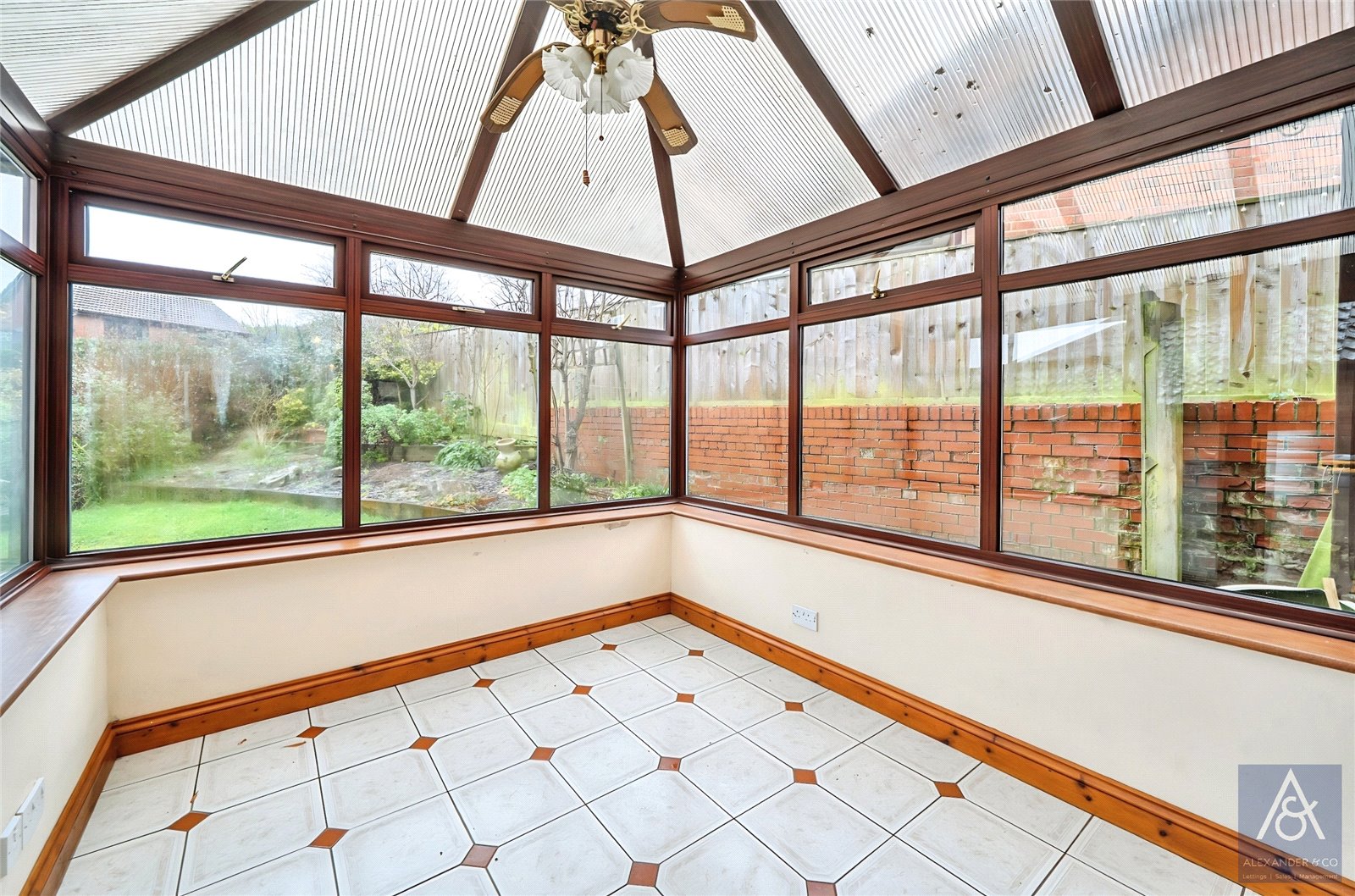 The rear garden is mainly laid to lawn with a tiled patio section and a range of shrubs and fruit trees. A side gate gives access to the double garage with electric roller doors, eaves storage and driveway space in front.