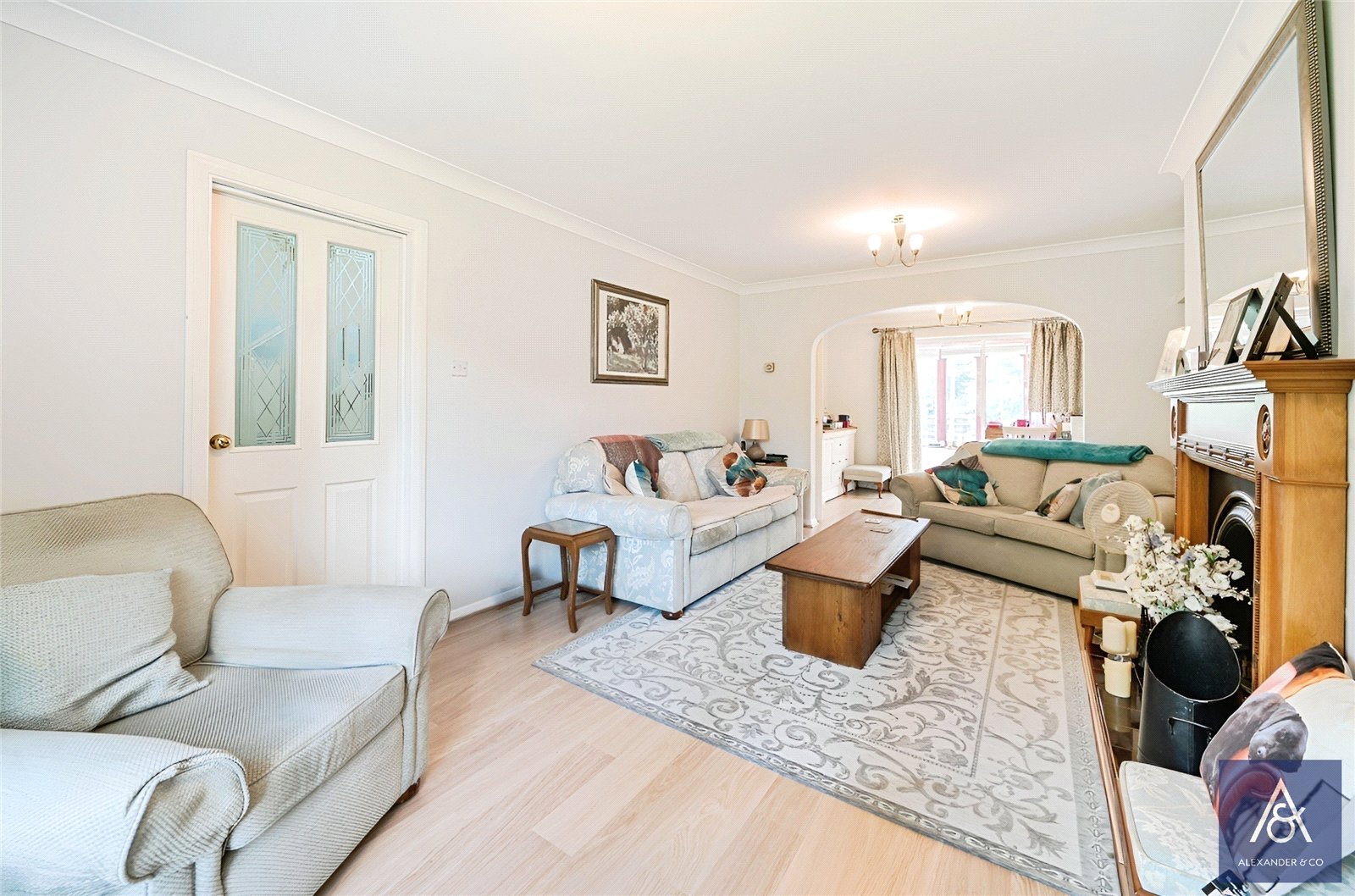 The rear garden is mainly laid to lawn and patio with mature shrubs, a shed and green house with side access to the front and a wooden fence surround. The front is laid to lawn with a double width driveway approaching a double garage with power and lighting.