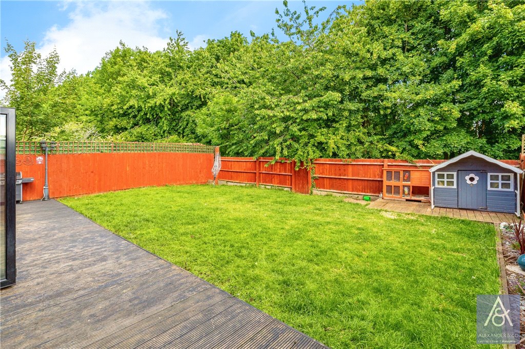 The rear garden is laid to lawn with a large timber sun deck, a gated here is a gated side access leads to the front and the garden overlooks mature tree screen to the rear boundary.