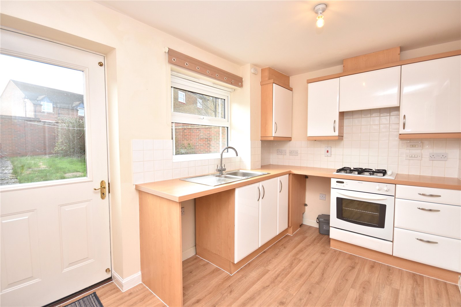 The accommodation comprises an entrance hallway with downstairs cloakroom / w.c., kitchen / breakfast room with gas hob, electric oven and door leading to the rear garden; and a dual aspect lounge / diner with laminate flooring, storage cupboard and French doors leading to the garden. Upstairs there is a master bedroom with built-in wardrobe, two further bedrooms and a family bathroom with separate bath and shower. The property further benefits from gas central heating, double glazing, neutral decor, an enclosed rear garden with rear access and access to a single garage in a block to the rear. Available Now!