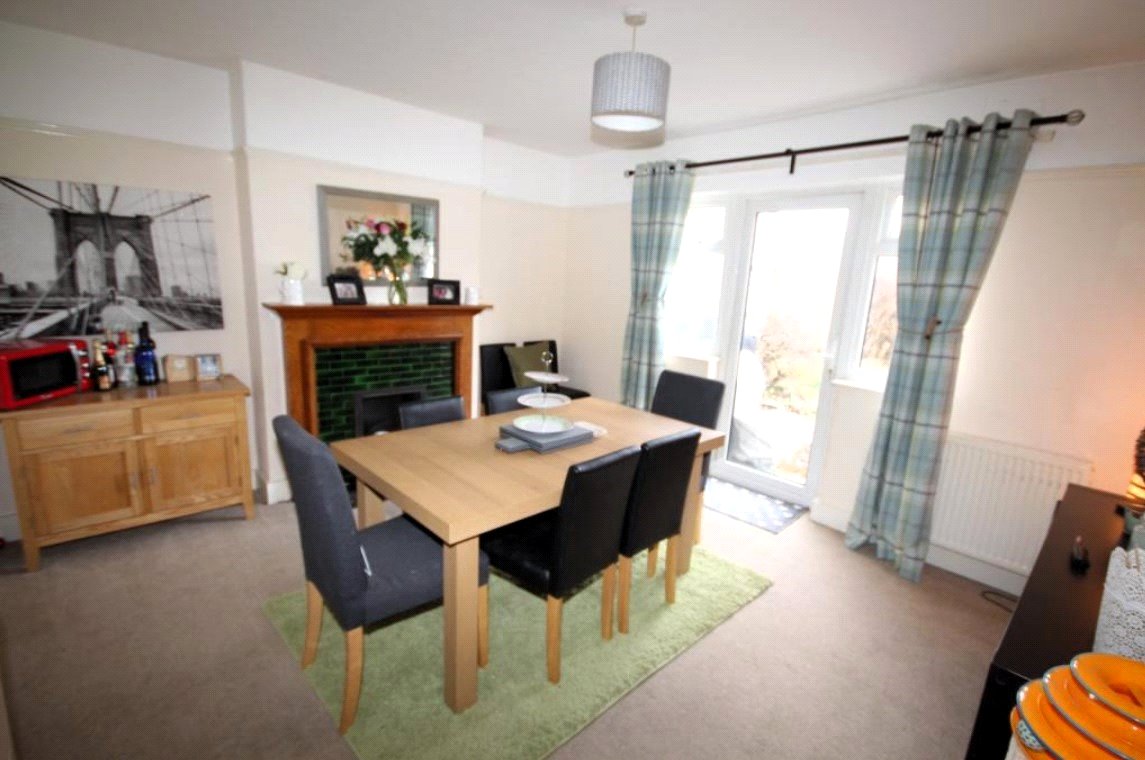 The property comprises an entrance hall, a fitted kitchen, and two versatile reception rooms that can be used as a living room or dining room. One reception room features patio doors leading to the rear garden, while the other is positioned at the front of the house. The accommodation includes two double bedrooms, an additional single bedroom, and a family bathroom with a shower. Pets considered.